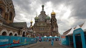 Чемпионат Европы по футболу Евро-2020 (УЕФА EURO 2020). Футбольная деревня Фестиваля УЕФА EURO 2020 на Конюшенной площади. Жанровая фотография. Входные ворота и павильоны на фоне храма Воскресения Христова Спас на Крови (Храм Спаса на Крови).