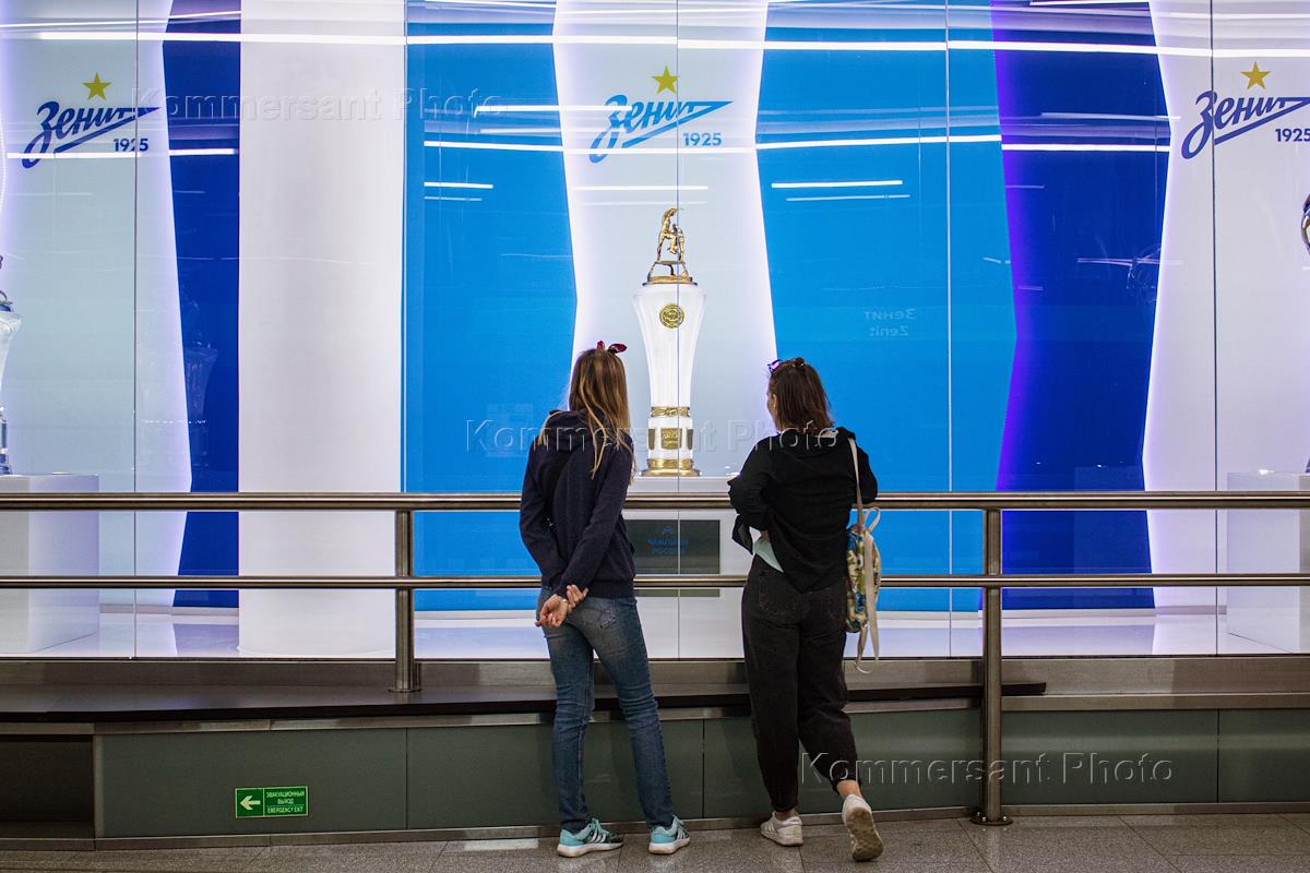 Празднование Дня России в Санкт-Петербурге. Жанровая фотография. Копии кубков команды "Зенит" на платформе станции Петербургского метрополитена "Зенит".