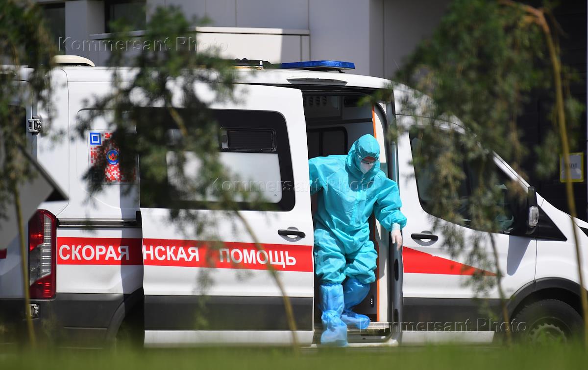 Медицинский центр по борьбе с коронавирусной инфекцией COVID-19 "Новомосковский" в поселке Коммунарка Новой Москвы. Медицинский работник в защитном костюме у автомобиля скорой медицинской помощи.