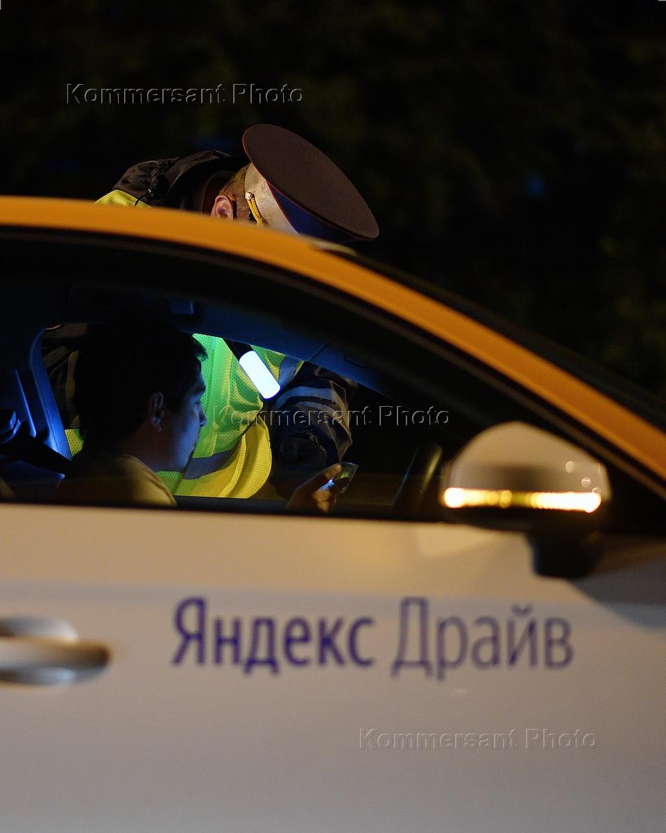 Рейд Государственной инспекции безопасности дорожного движения (ГИБДД) по городу Москве по выявлению нетрезвых водителей. Жанровая фотография. Сотрудник дорожно-патрульной службы (ДПС) и водитель такси во время рейда.