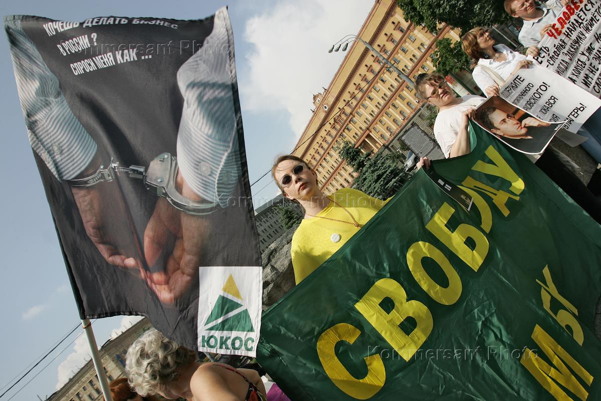 Пикет, приуроченный ко дню рождения Михаила Ходорковского и организованный общественной группой "Совесть", прошел на Лубянской площади у Соловецкого камня. Плакат "Меняю Путина на Ходорковского!".