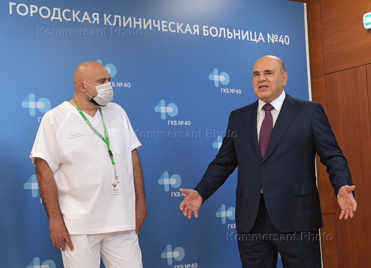 Посещение председателя правительства России Михаила Мишустина медицинского центра по борьбе с коронавирусной инфекцией COVID-19 "Новомосковский". Главный врач московской городской клинической больницы №40 "Коммунарка" Денис Проценко (слева) и председатель правительства России Михаил Мишустин (справа) во время общения с руководителями ведущих медицинских учреждений в новом детском инфекционном корпусе больницы.
