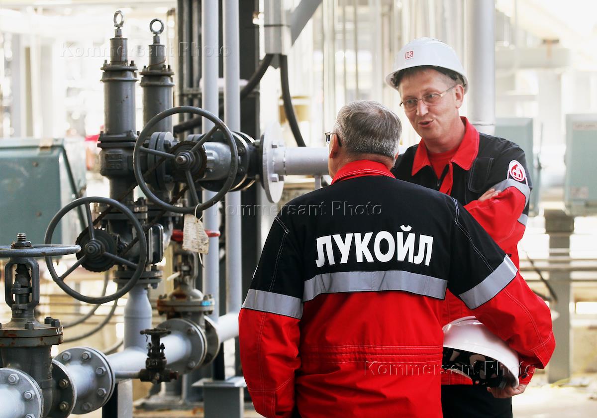 Церемония запуска комплекса изомеризации нефти "Пенекс" на заводе ООО "Лукойл Нижегороднефтеоргсинтез". Виды территории завода ООО "Лукойл Нижегороднефтеоргсинтез". Жанровая фотография. Рабочие в униформе с символикой "Лукойл" у вентилей.