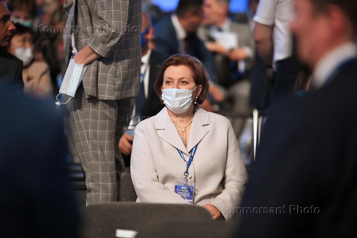 XX Съезд партии "Единая Россия" в Центральном выставочном комплексе "Экспоцентр". Руководитель Федеральной службы по надзору в сфере защиты прав потребителей и благополучия человека - главный государственный санитарный врач России Анна Попова (в центре) во время работы съезда.