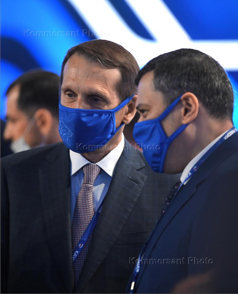 XX Congress of the United Russia party at the Expocentre Central Exhibition Complex. Director of the Foreign Intelligence Service Sergei Naryshkin (left) and Chairman of the Russian State Duma Committee for Information Policy, Information Technology and Communications Alexander Khinshtein (right) during the congress.
