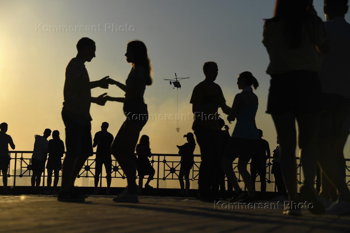 Fire at a pyrotechnics warehouse on the Luzhnetskaya embankment. Helicopter EMERCOM of Russia during fire extinguishing.