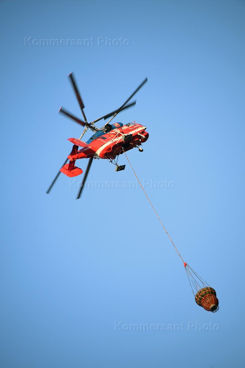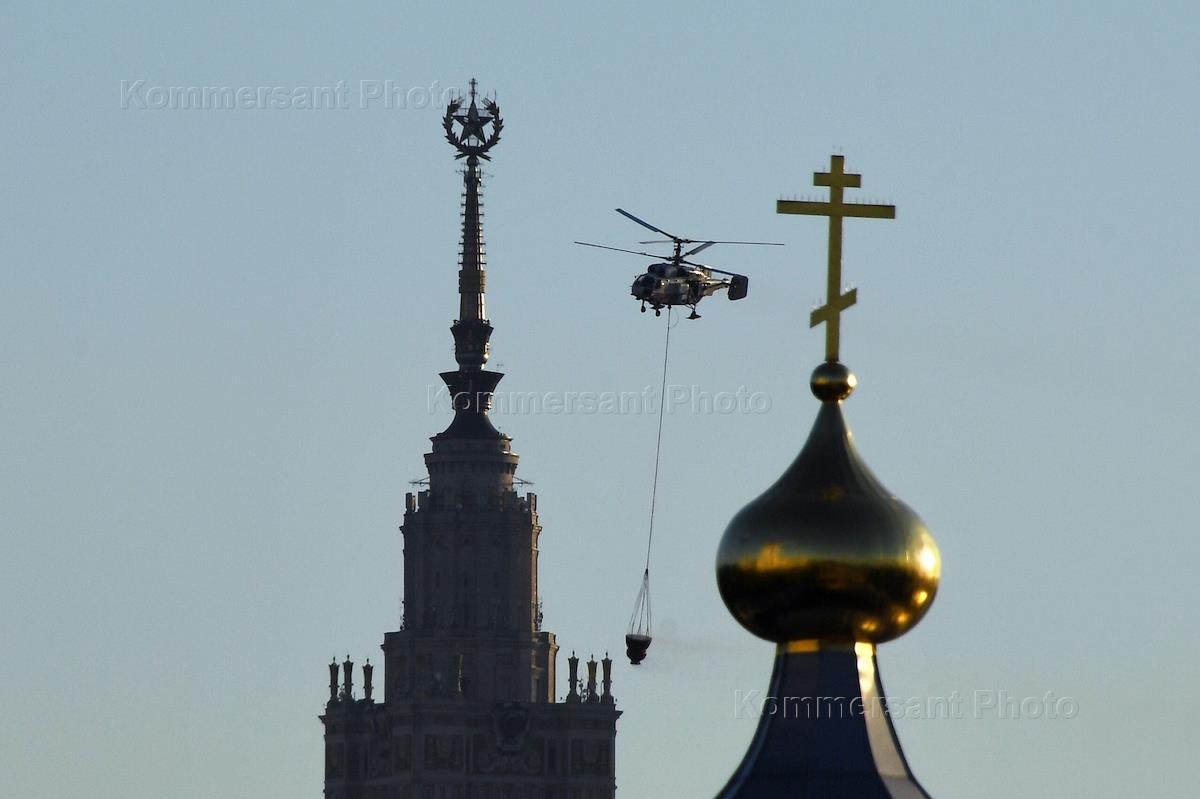 Fire at a pyrotechnics warehouse on the Luzhnetskaya embankment. Helicopter EMERCOM of Russia during fire extinguishing.