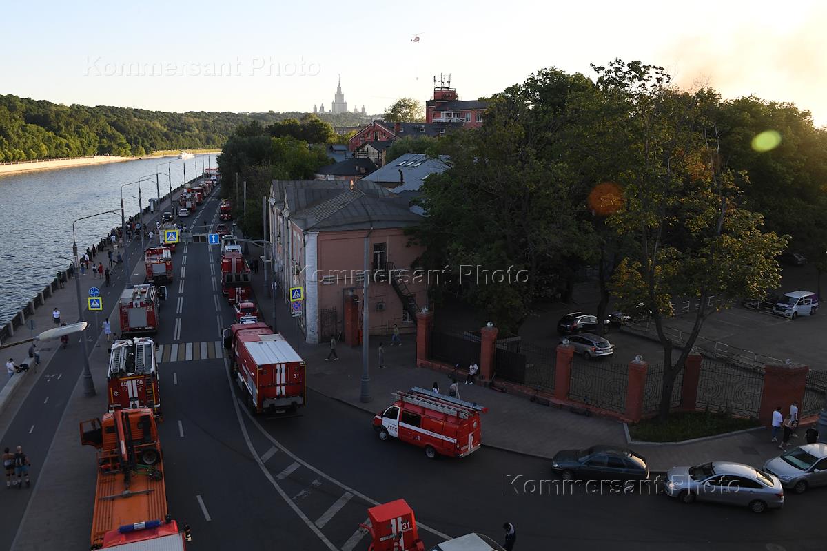 Пожар на складе пиротехники на Лужнецкой набережной. Автомобили МЧС России на месте происшествия.