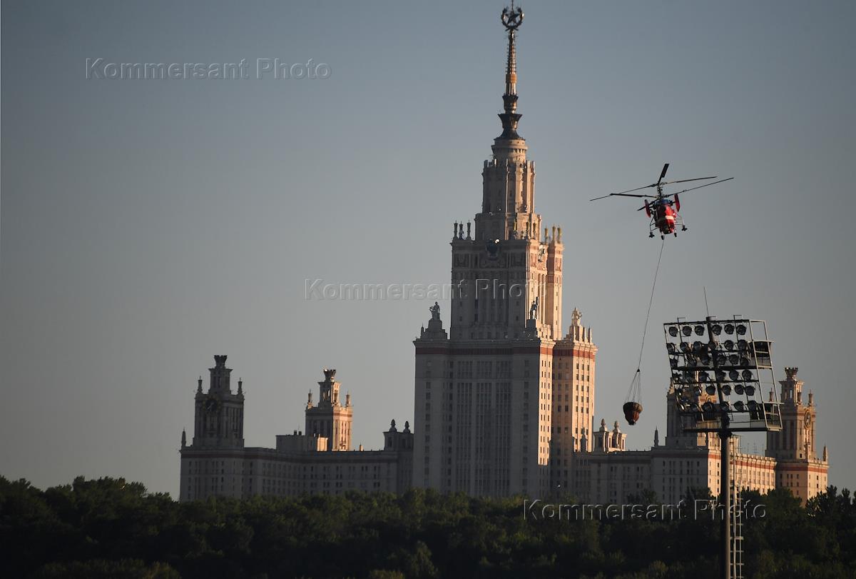 Пожар на складе пиротехники на Лужнецкой набережной. Вертолет МЧС России во время ликвидации пожара.