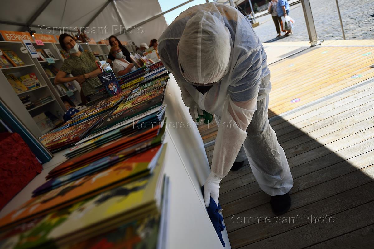VII ежегодный книжный фестиваль "Красная площадь". Жанровая фотография. Дезинфекция книжного павильона.