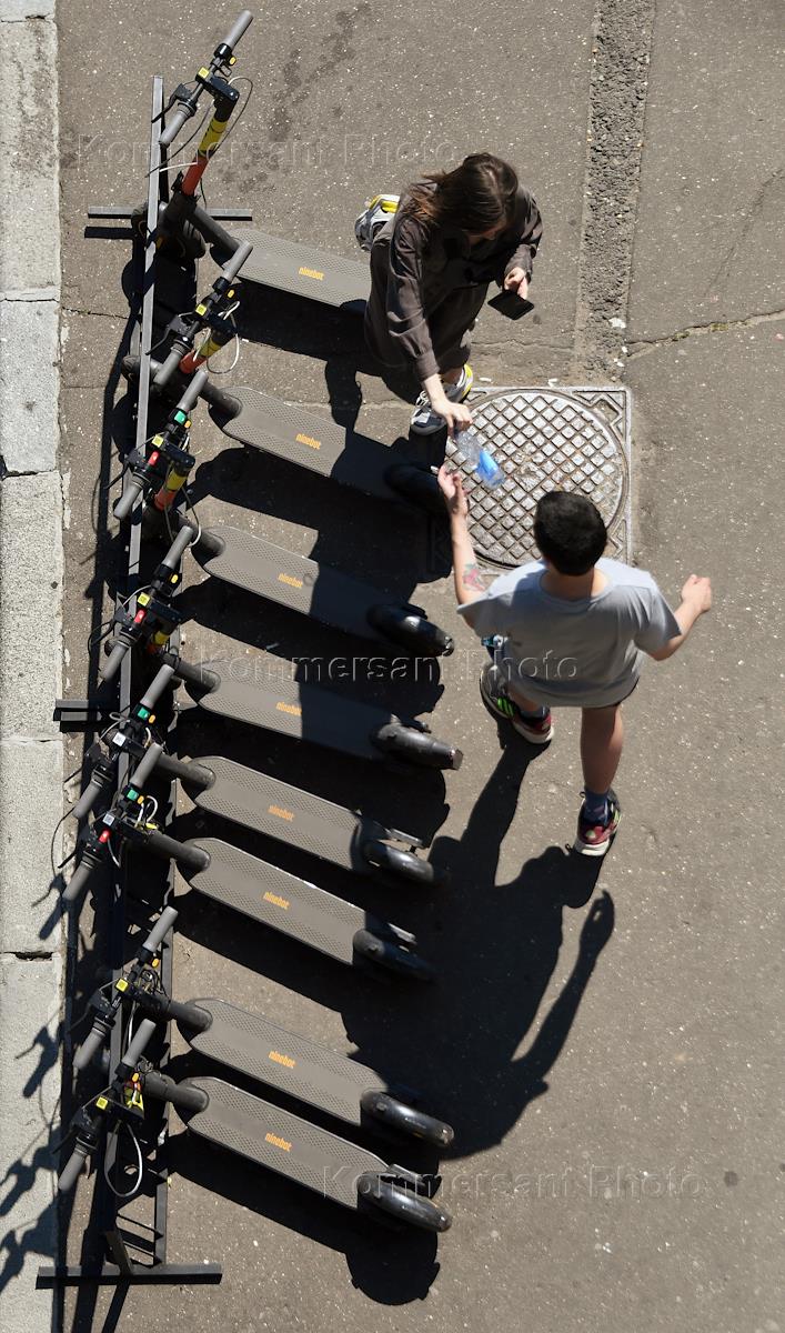 Views of Moscow. Genre photography. Vacationers in the Muzeon park near the electric scooter rental point.