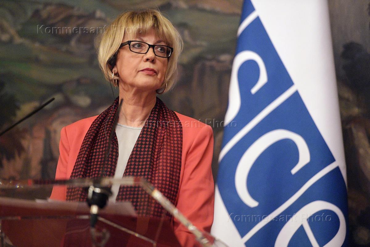 Secretary General of the Organization for Security and Cooperation in Europe (OSCE) Helga Schmid during a news conference following talks with Russian Foreign Minister Sergei Lavrov at the Russian Foreign Ministry's Reception House.