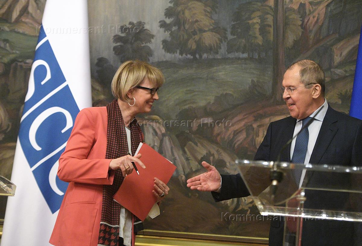Secretary General of the Organization for Security and Cooperation in Europe (OSCE) Helga Schmid (left) and Russian Foreign Minister Sergei Lavrov (right) during a news conference following talks at the Russian Foreign Ministry's Reception House.