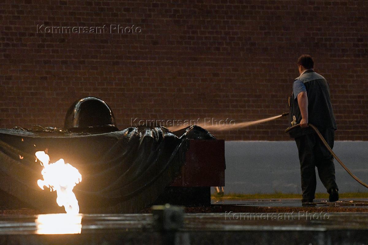 Виды ночной Москвы. Жанровая фотография. Уборка территории Мемориала "Могила Неизвестного Солдата" в Александровской саду.