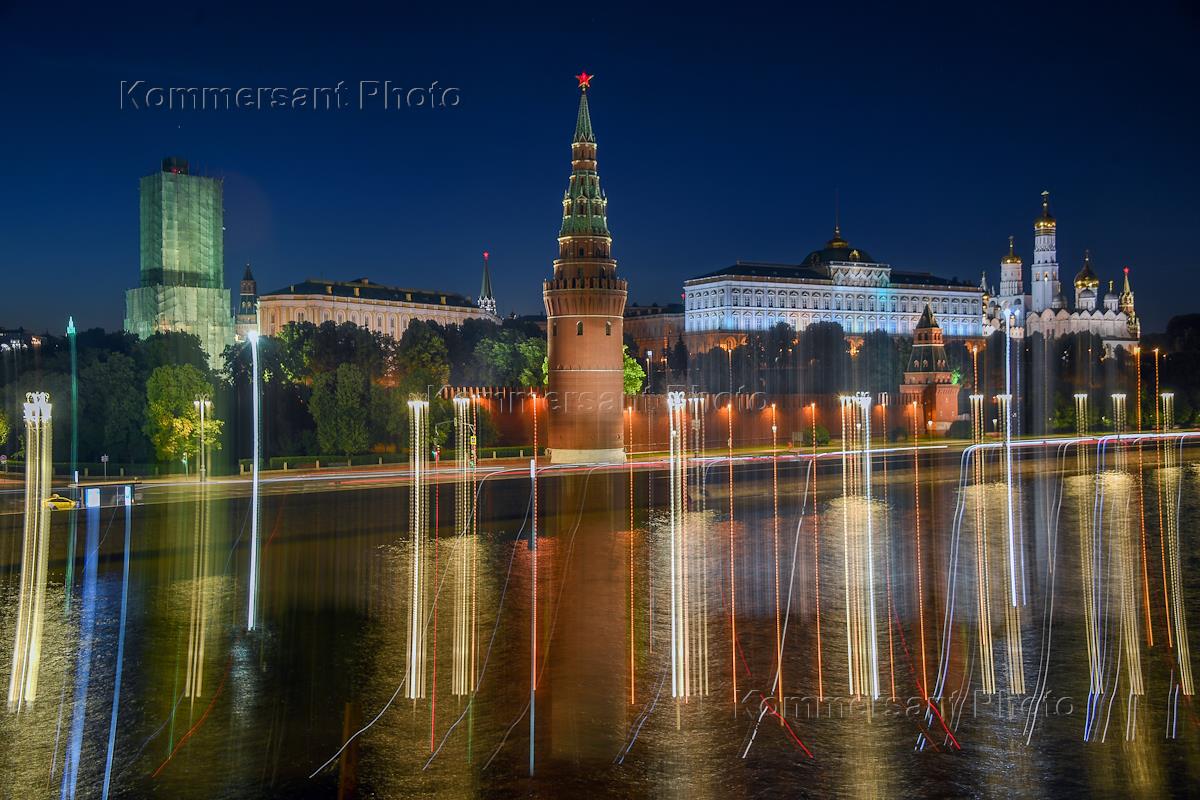 Виды ночной Москвы. Московский Кремль и Кремлевская набережная Москвы-реки.