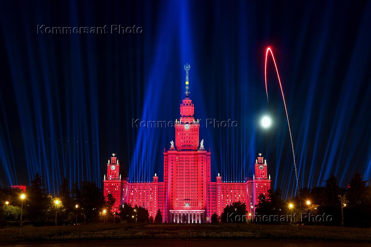 Виды ночной Москвы. Главное здание Московского государственной университета (МГУ) имени М.В.Ломоносова на Воробьевых горах.
