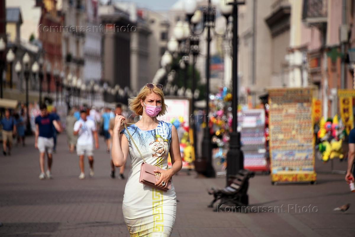 Views of Moscow during the third wave of the spread of coronavirus and COVID-19 infection. Genre photography. A girl in a medical protective mask on the Arbat.