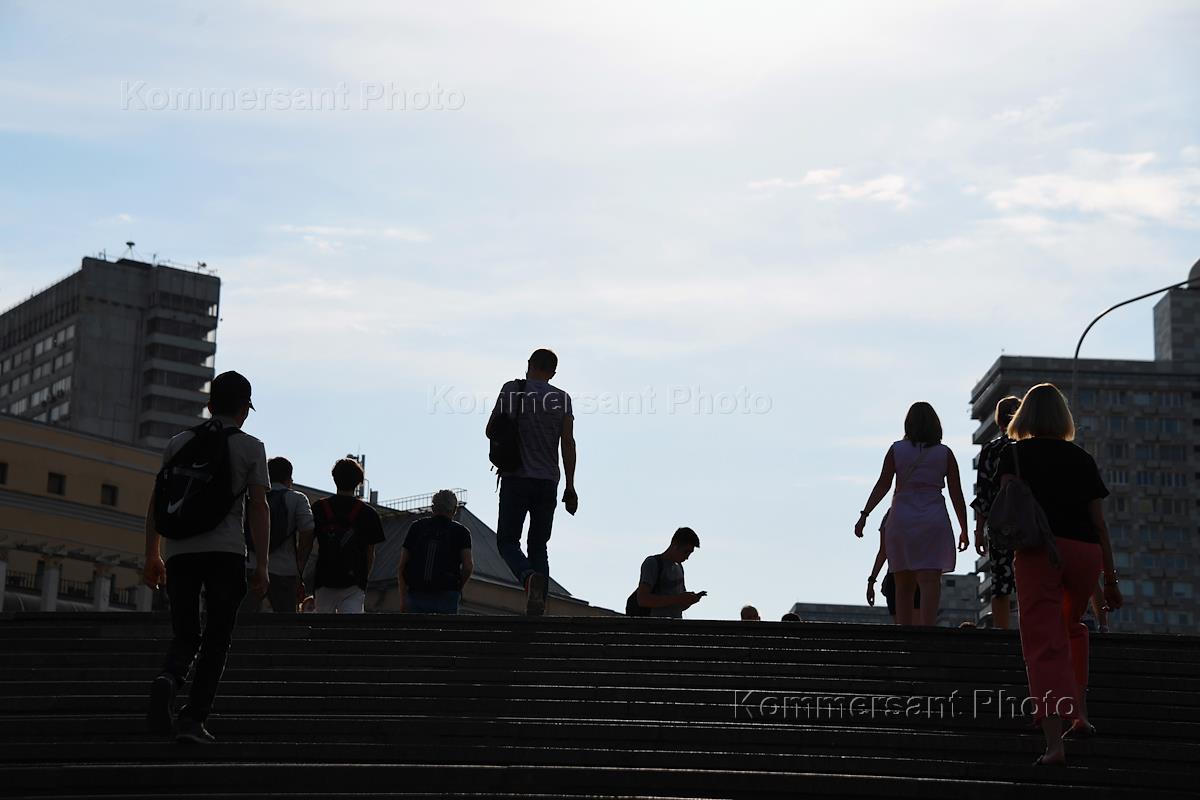 Moscow during the restrictive measures introduced in the city from June 13, 2021 due to the spread of the coronavirus infection COVID-19. Genre photography. Passers-by at the underground pedestrian crossing on Arbat Square.