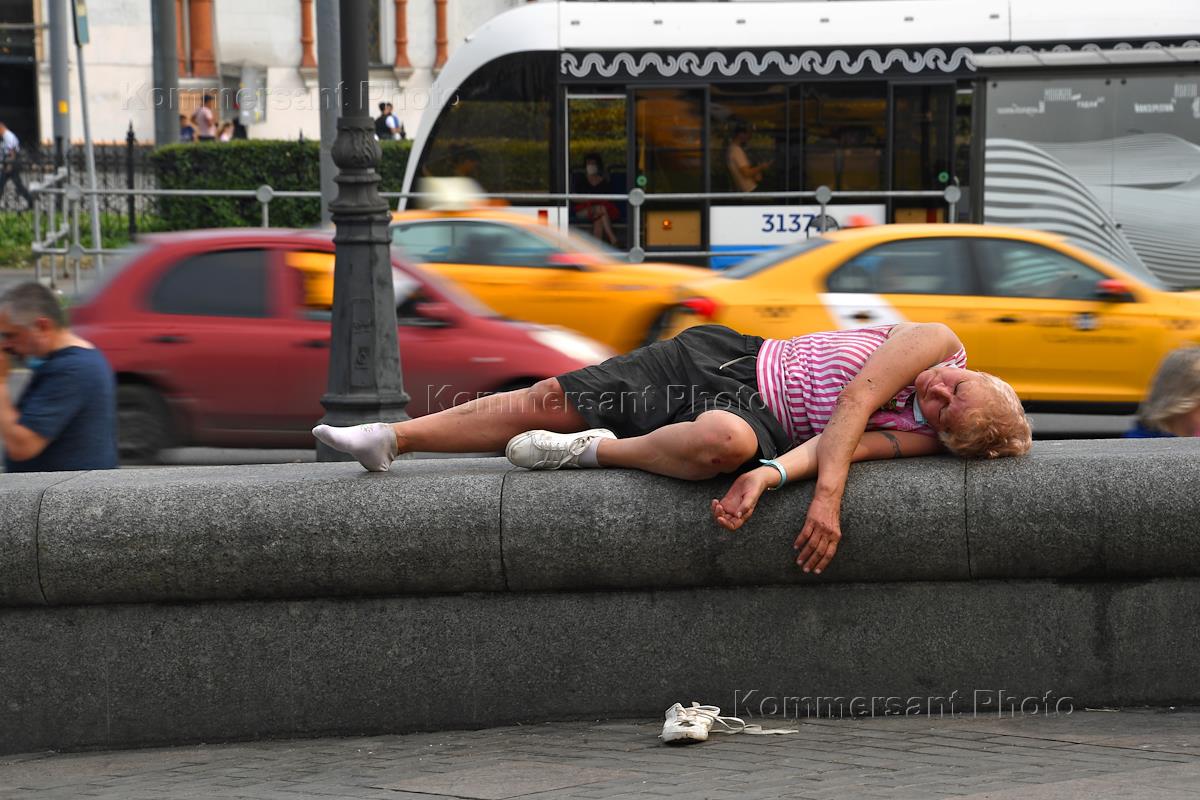 Виды Москвы во время ограничительных мер введенных в городе с 13 июня 2021 в связи с распространением коронавирусной инфекции COVID-19. Жанровая фотография. Женщина спит на парапете на Комсомольской площади (площадь Трех вокзалов).