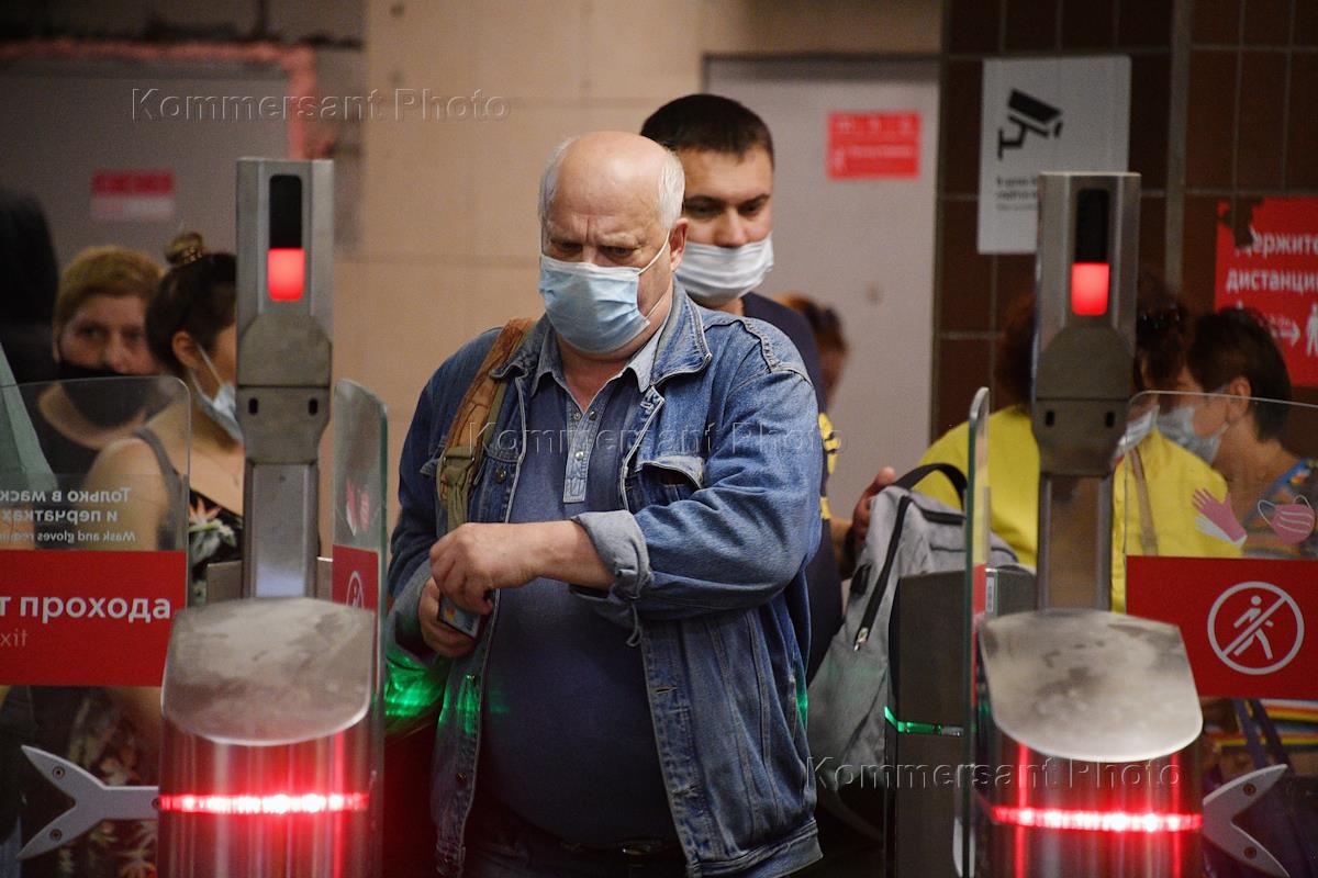 Виды Москвы во время ограничительных мер введенных в городе с 13 июня 2021 в связи с распространением коронавирусной инфекции COVID-19. Жанровая фотография. Пассажиры в медицинских защитных масках у турникетов железнодорожного вокзала.