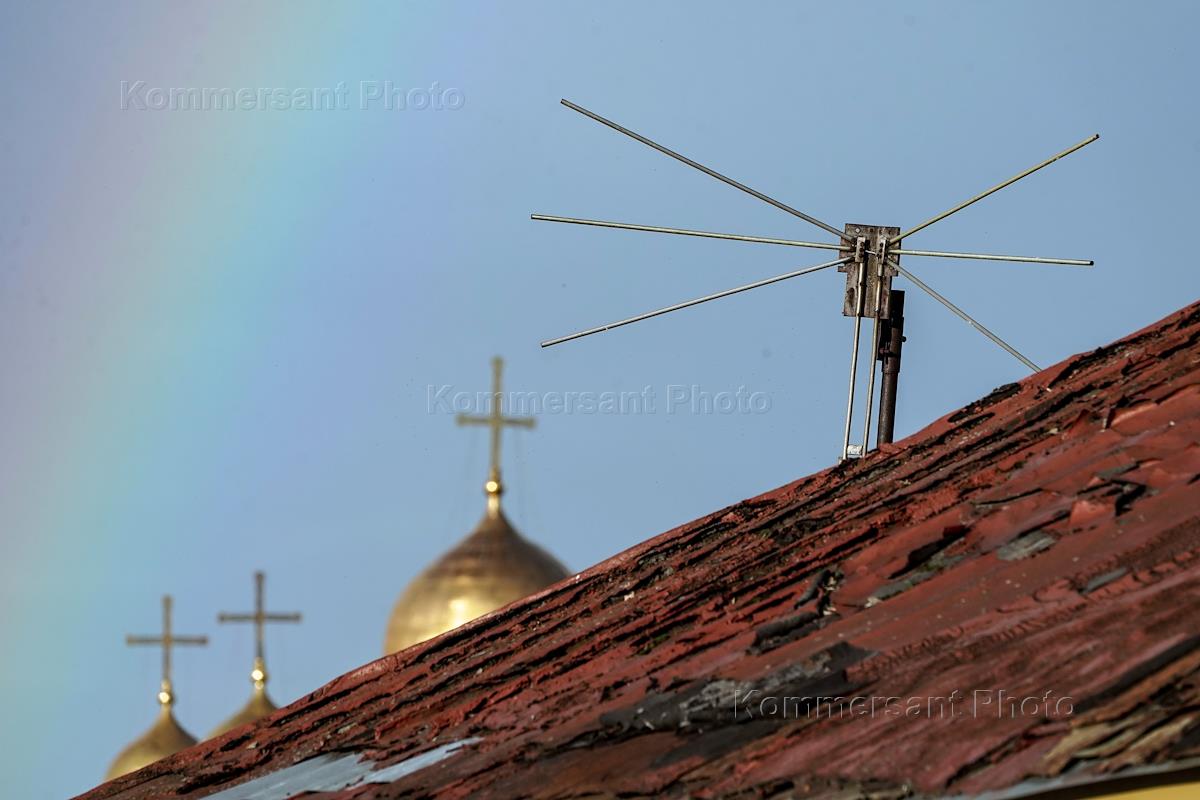 Genre photography. TV antenna on the roof of the house, domes of an Orthodox church and a rainbow in the sky.