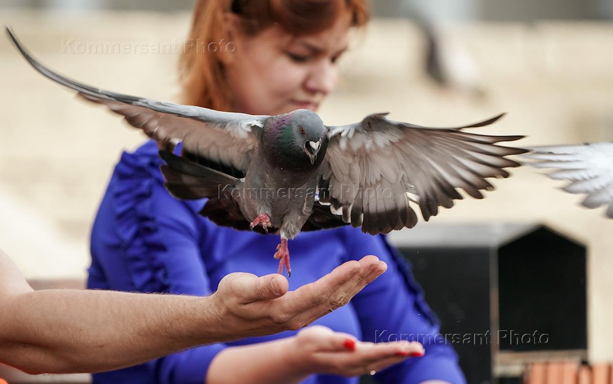 Genre photography. People feed pigeons from the palm of their hand.