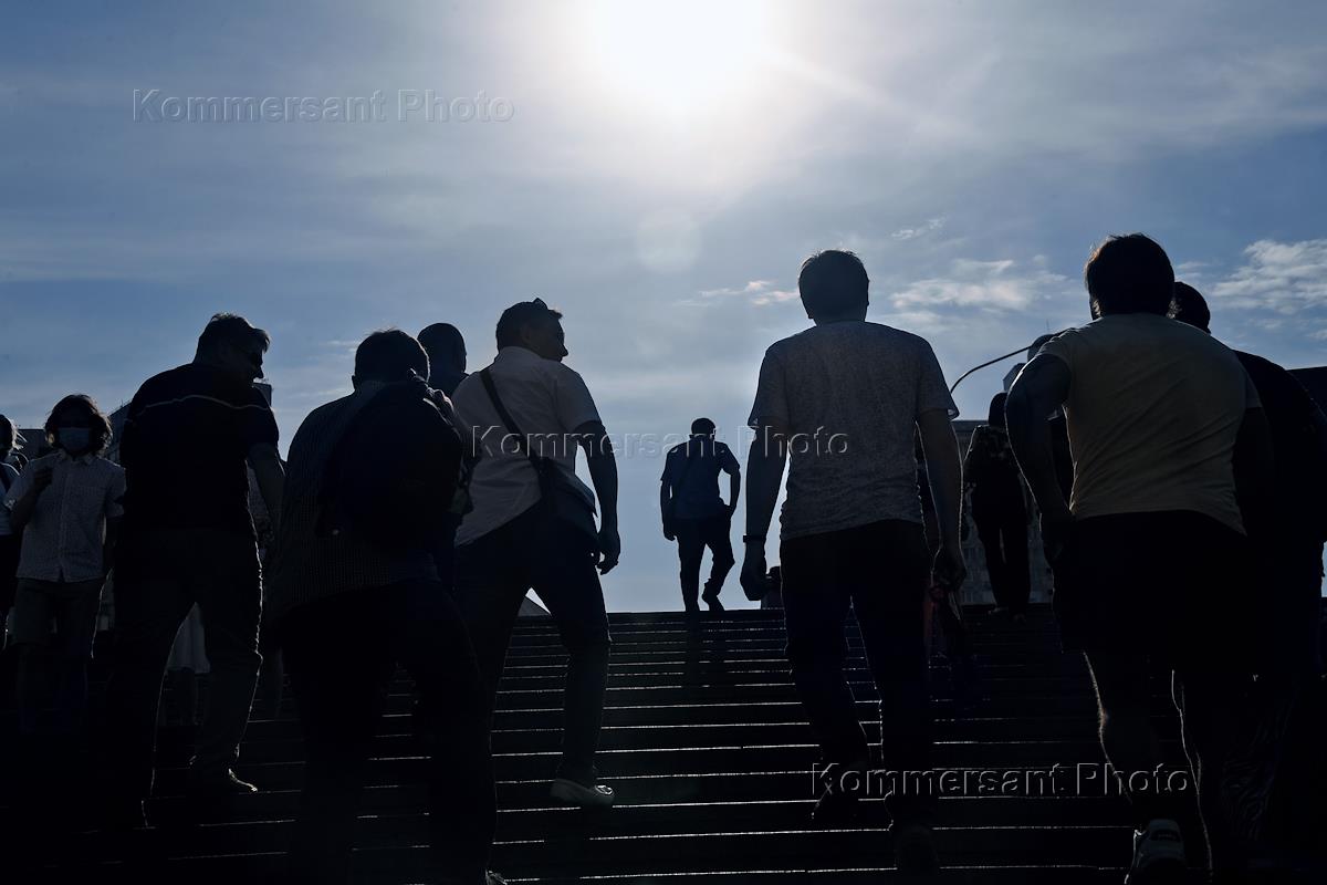 Views of Moscow during the restrictive measures introduced in the city from June 13, 2021 due to the spread of the coronavirus infection COVID-19. Genre photography. Passers-by.