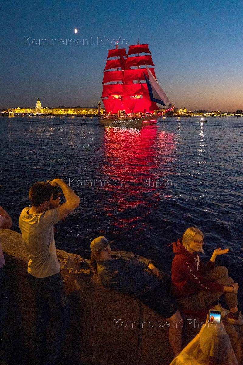 Rehearsal for the Scarlet Sails graduation party. Russia Brig in the water area of the Neva river.