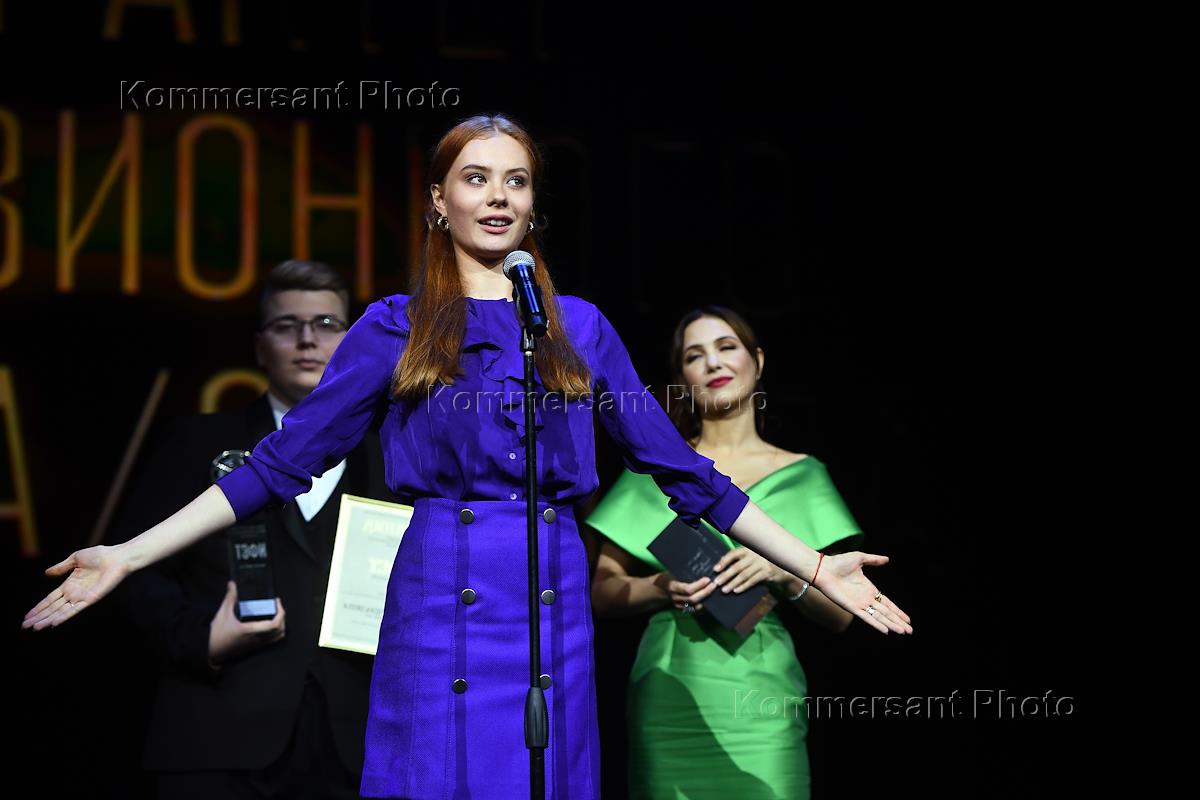Церемония награждения победителей Всероссийского телевизионного конкурса "ТЭФИ-Летопись Победы" в Московском театре Et Cetera. Актриса Мирослава (Алина) Михайлова во время церемонии.