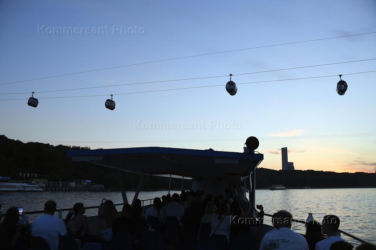 Views of evening Moscow. Genre photography. Passengers on a motor ship during a river walk and the Vorobyovy Gory cable car over the Moskva River.