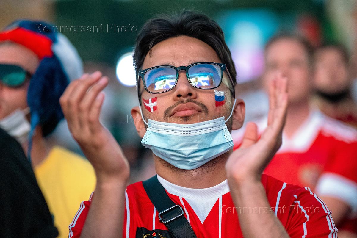European Football Championship 2020. Genre photography. Fans in the fan zone on Konyushennaya Square during the match between the national teams of Denmark and Russia.