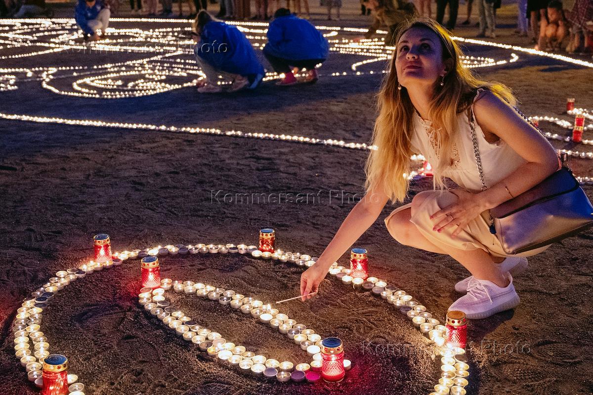 The Candle of Memory campaign on the 80th anniversary of the Great Patriotic War was held on the Marsovo Pole. On the night of June 22, the Victory volunteers laid out burning candles along the contour, forming the shape of the medal For the Defense of Leningrad. Genre photography. Participants during the campaign.