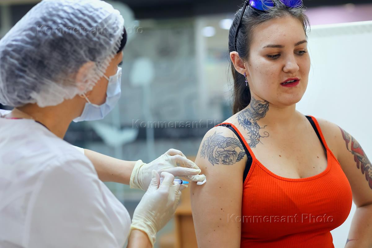 Проведение вакцинации от коронавирусной инфекции COVID-19 мобильными бригадами. Жанровая фотография.