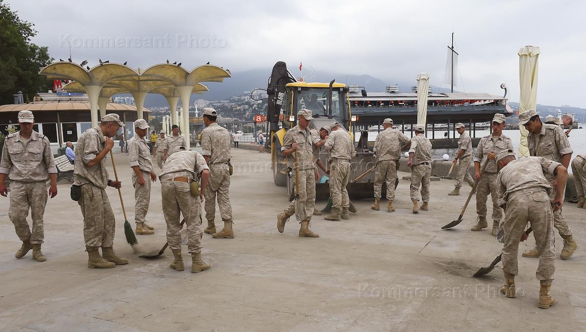 Военнослужащие во время ликвидации последствий наводения из-за сильных дождей, вызвавших подтопления домов, на набережной Ялты.