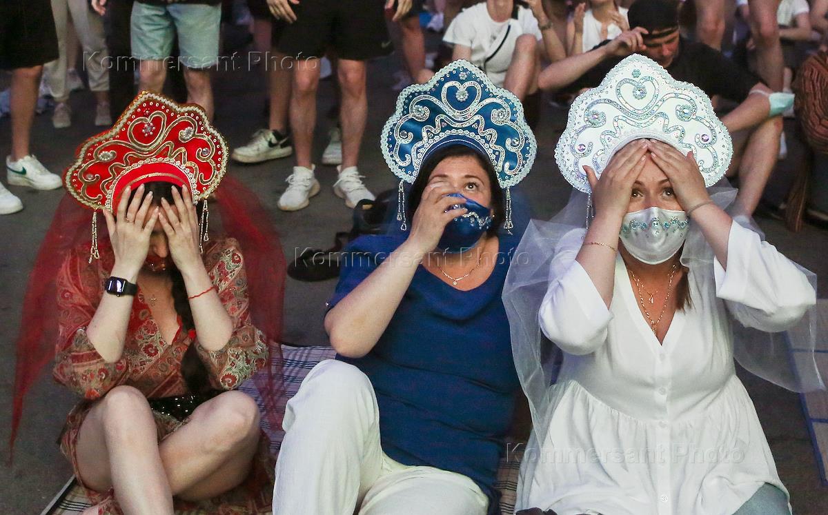 Fan zone for the European Football Championship UEFA EURO 2020 on Konyushennaya Square. Cheerleaders wearing kokoshniks during a match between the national teams of Russia and Denmark.