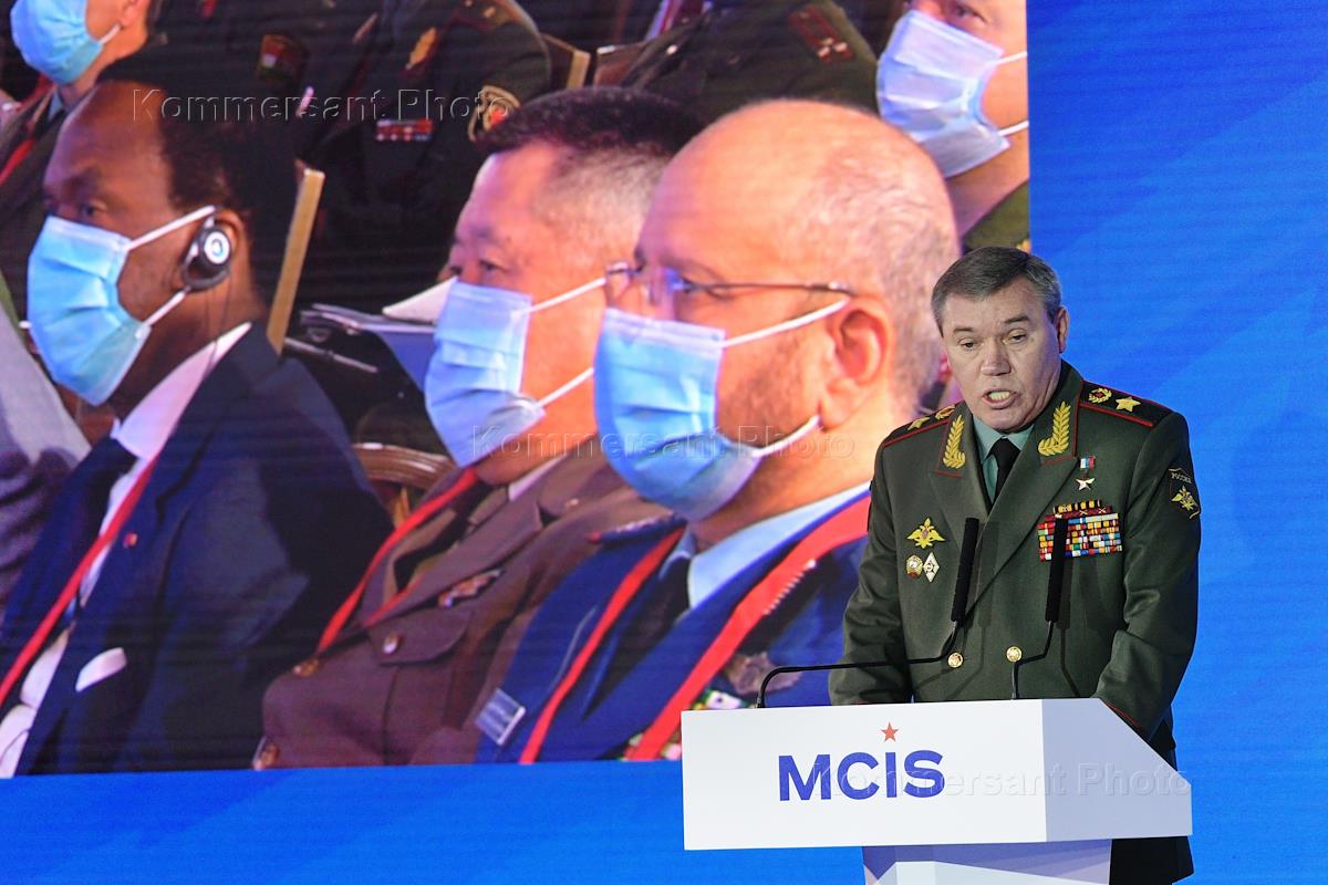 IX Московская конференция по международной безопасности MCIS-2021, организованная Министерством обороны России, в конгресс-парке гостиницы "Украина" (Radisson Collection Hotel). Начальник Генерального штаба Вооруженных сил России - первый заместитель министра обороны России Валерий Герасимов во время конференции.