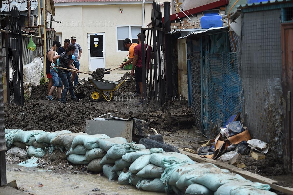 Volunteers during the Crimean clean-up event in Yalta, organized to clean up the resort town after a severe flood. Elimination of the aftermath of the flood by EMERCOM employees and military personnel.