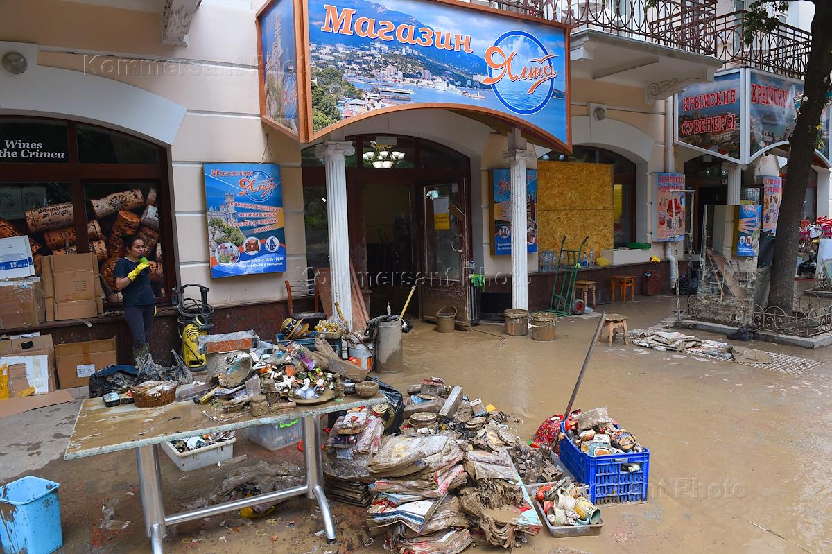 Crimean clean-up event in Yalta, organized to eliminate the aftermath of floods and overflowing the banks of the Vodopadnaya River on June 18, 2021. Genre photography. Yalta shop suffered from the flood.