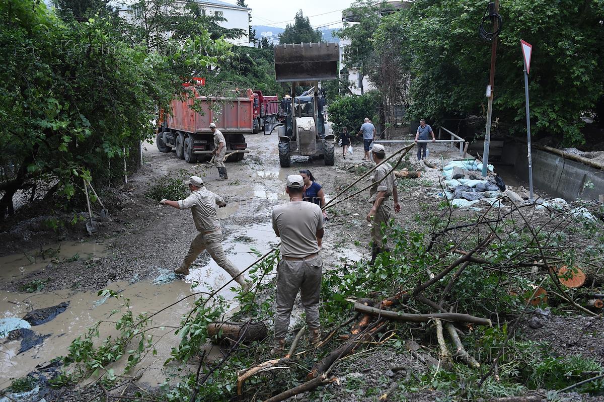 Crimean clean-up event in Yalta, organized to eliminate the aftermath of floods and overflowing the banks of the Vodopadnaya River on June 18, 2021. Genre photography. Servicemen during the clean-up.