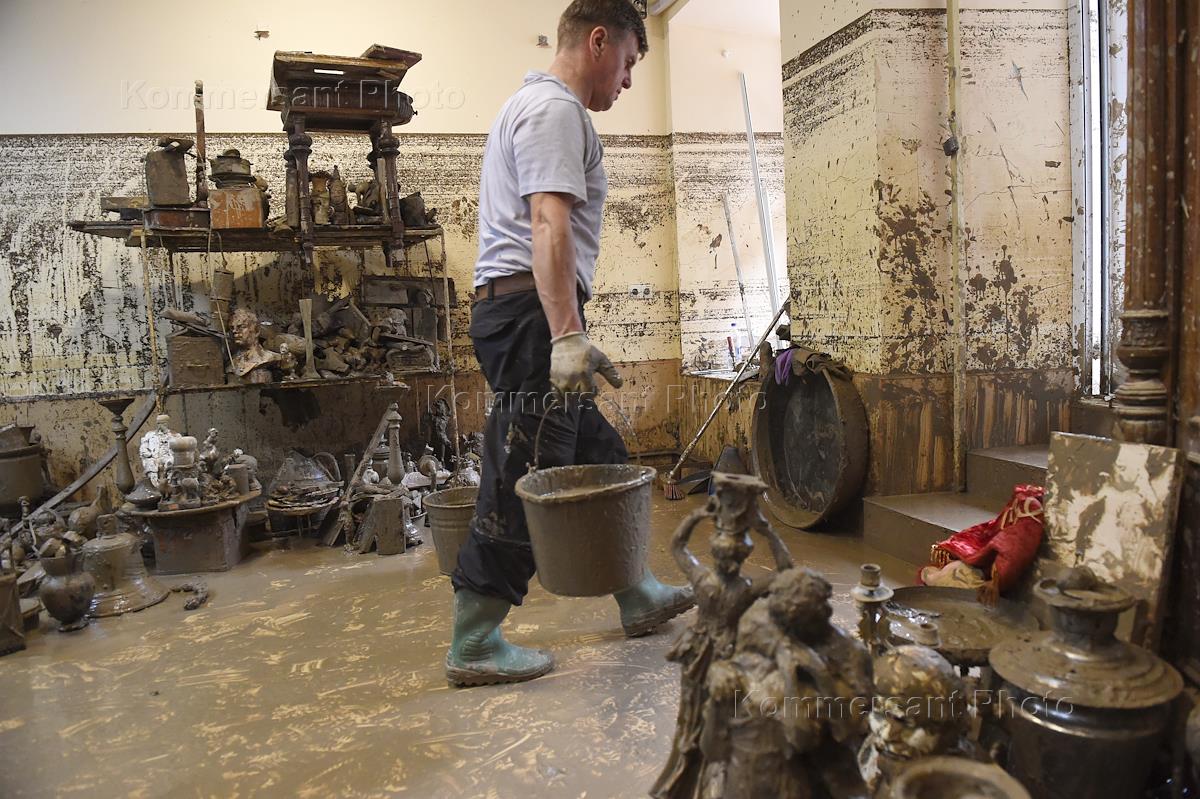 Crimean clean-up event in Yalta, organized to eliminate the aftermath of floods and overflowing the banks of the Vodopadnaya River on June 18, 2021. Genre photography. A resident of a private house during the liquidation of the aftermath of a flood.