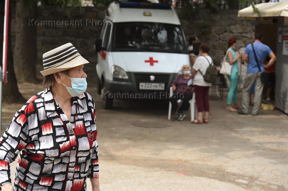 Views of Yalta. Genre photography. Elderly woman in a medical mask near the ambulance car.