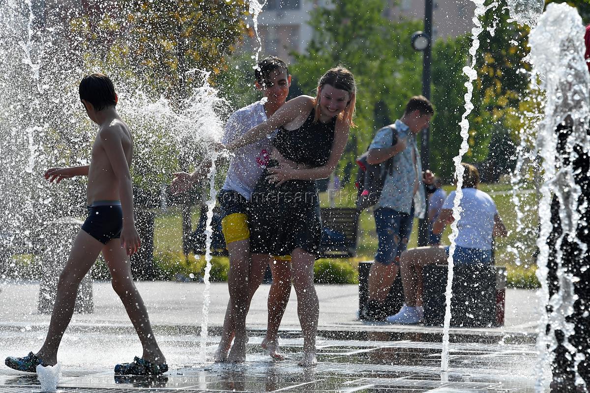 Heat in Moscow. Genre photography. Girls in swimsuits near the Dancing Fountains in the park on Khodynskoye Pole.