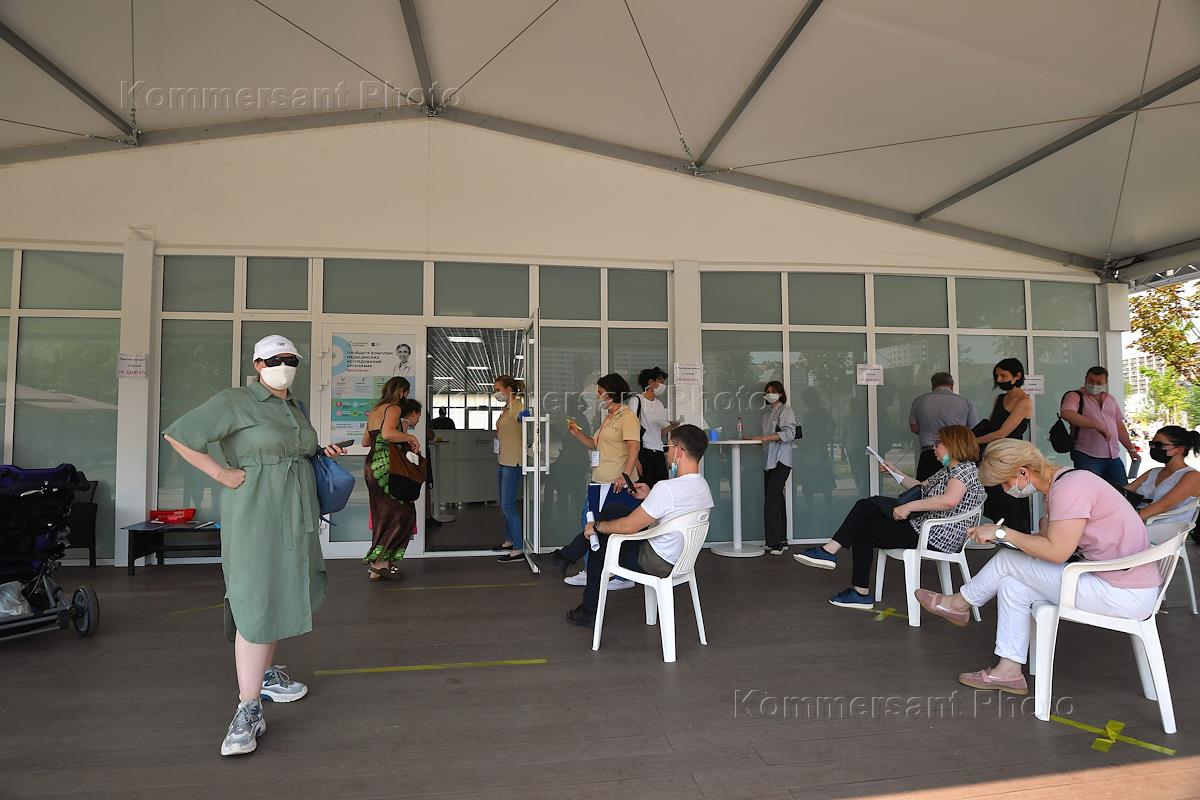 Пункт вакцинации от коронавирусной инфекции COVID-19 в павильоне "Здоровая Москва" в парке на Ходынском поле. Жанровая фотография. Пациенты в очереди перед вакцинацией.