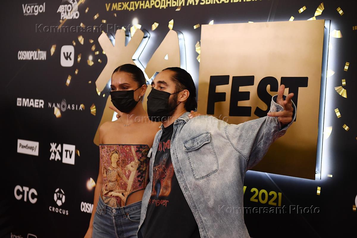 Opening ceremony of the V Zhara International Music Festival in the Crocus City Hall Concert Hall. Rapper Mot (Matvey Melnikov) (right) and his wife Maria Melnikova (left) at the ceremony.