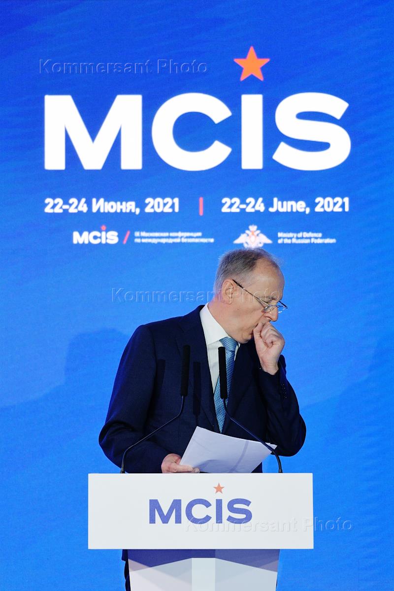 IX Moscow Conference on International Security MCIS-2021, organized by the Russian Ministry of Defense, in the congress park of the Ukraine Hotel (Radisson Collection Hotel). Russian Security Council Secretary Nikolai Patrushev speaking at a conference.