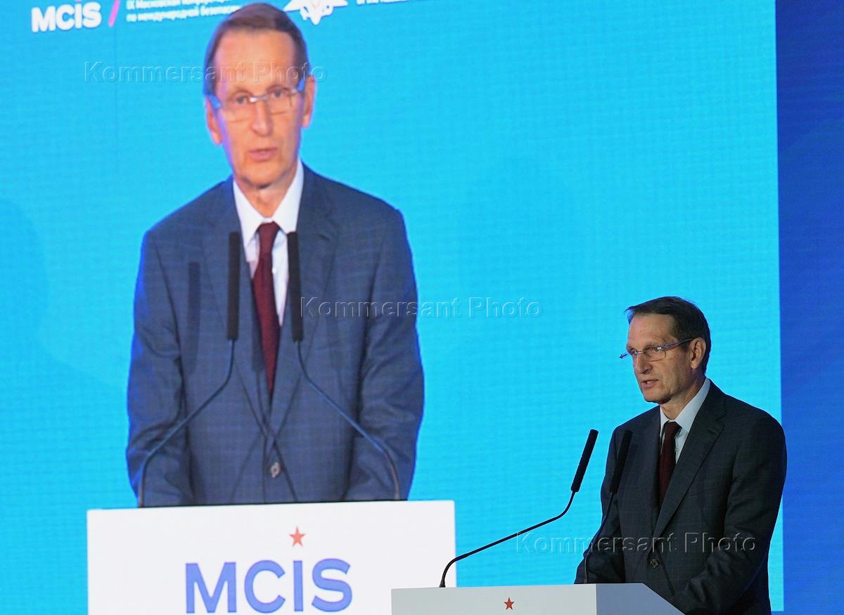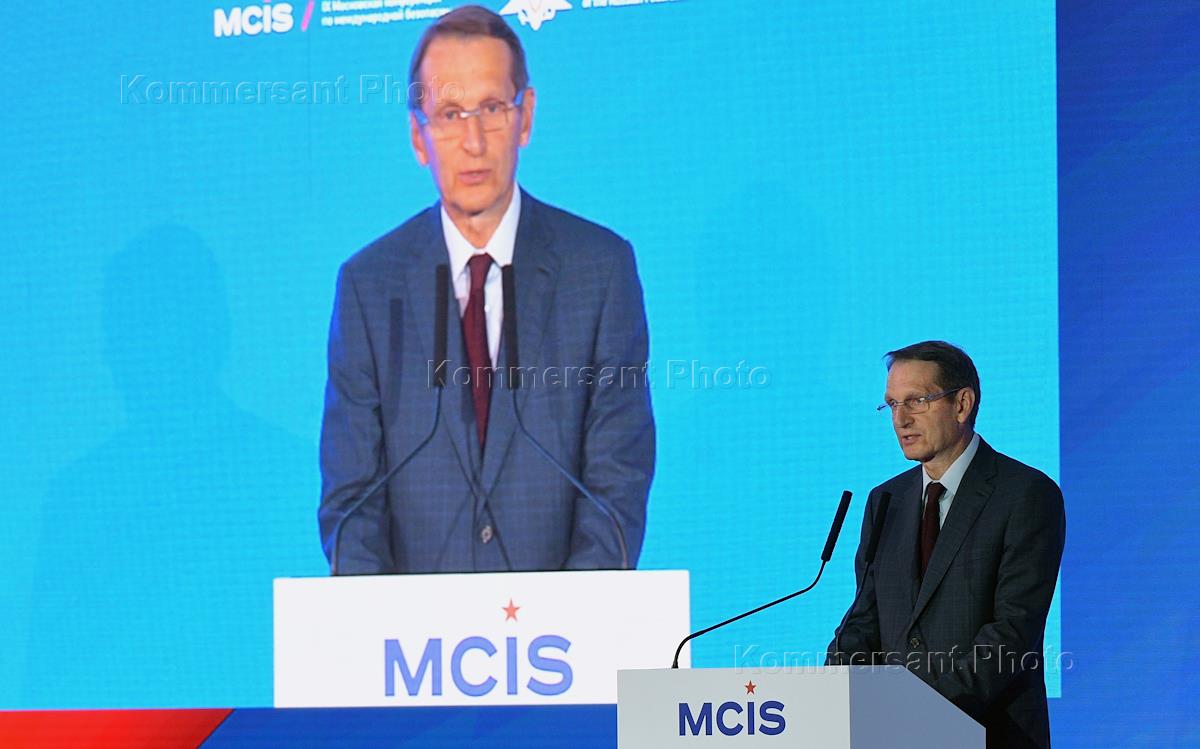 IX Московская конференция по международной безопасности MCIS-2021, организованная Министерством обороны России, в конгресс-парке гостиницы "Украина" (Radisson Collection Hotel). Директор Службы внешней разведки России Сергей Нарышкин во время выступления на конференции.