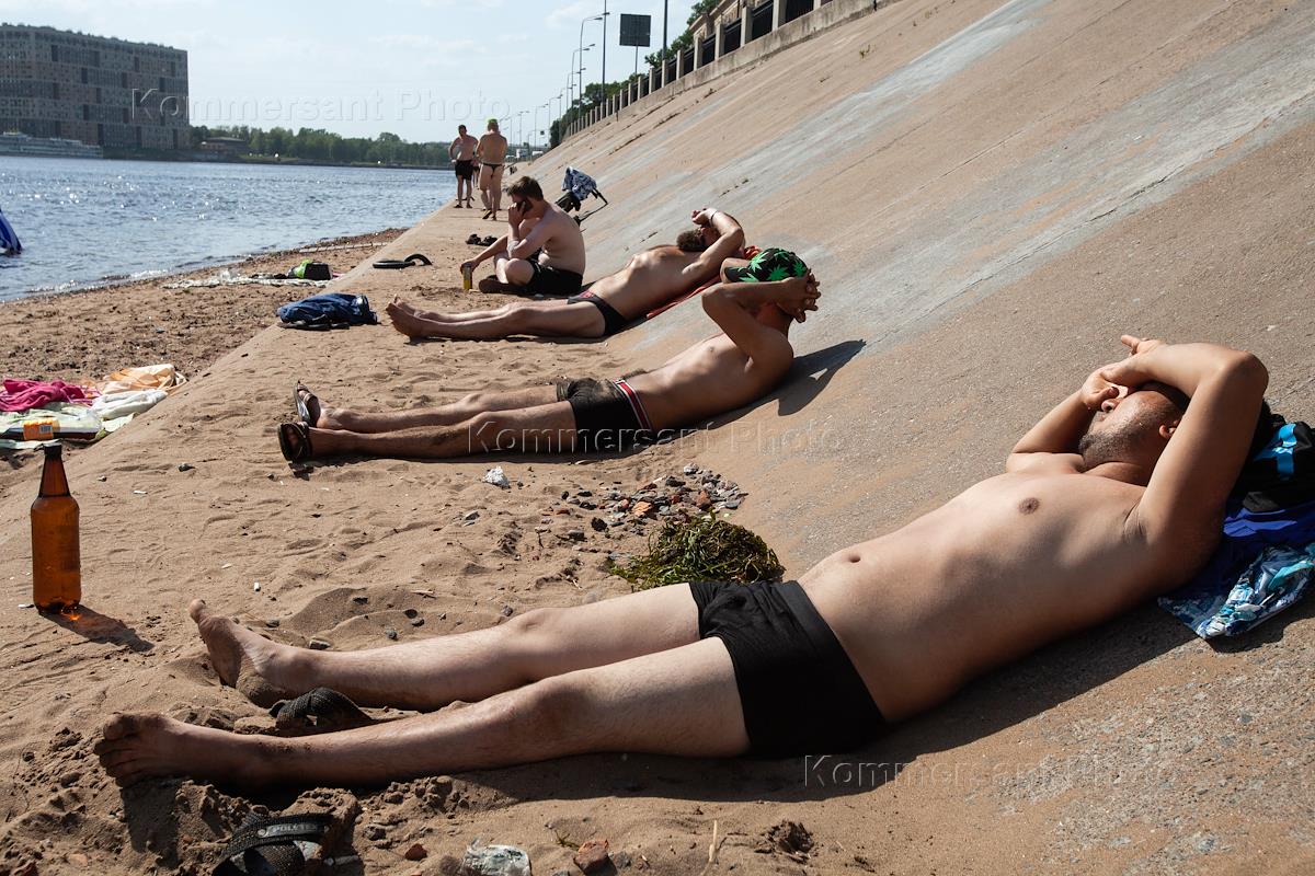 Genre photography. Vacationers on the banks of the Neva River.