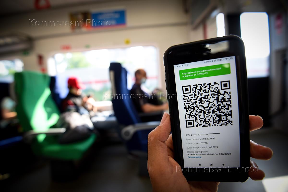 Genre photography. A girl holds a smartphone with a QR code of a certificate of vaccination against coronavirus infection COVID-19.