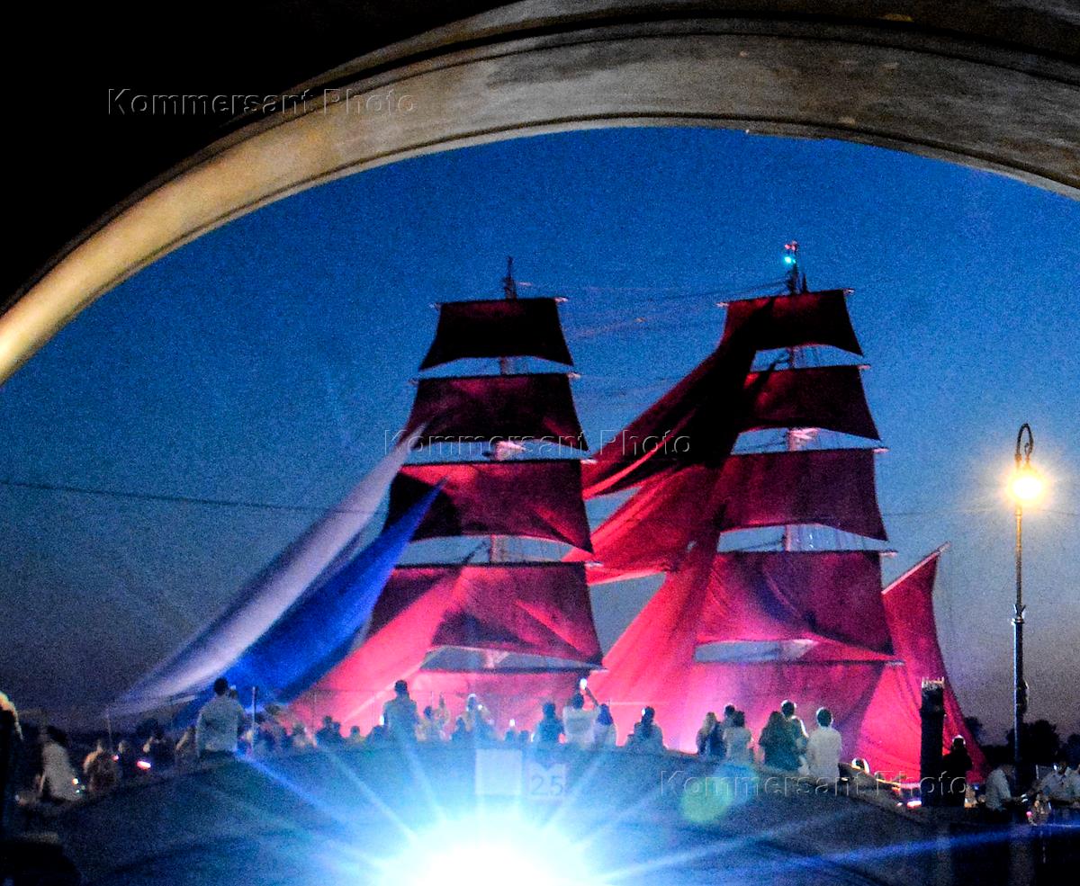 Dress rehearsal of the Scarlet Sails event for school graduates in St. Petersburg. Genre photography. Russia Brig in the water area of the Neva River. Genre photography.
