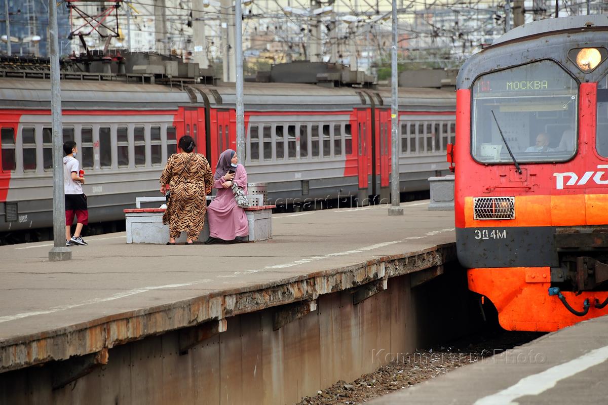 Genre photography. A commuter train passenger on the platform of the Kursk railway station.